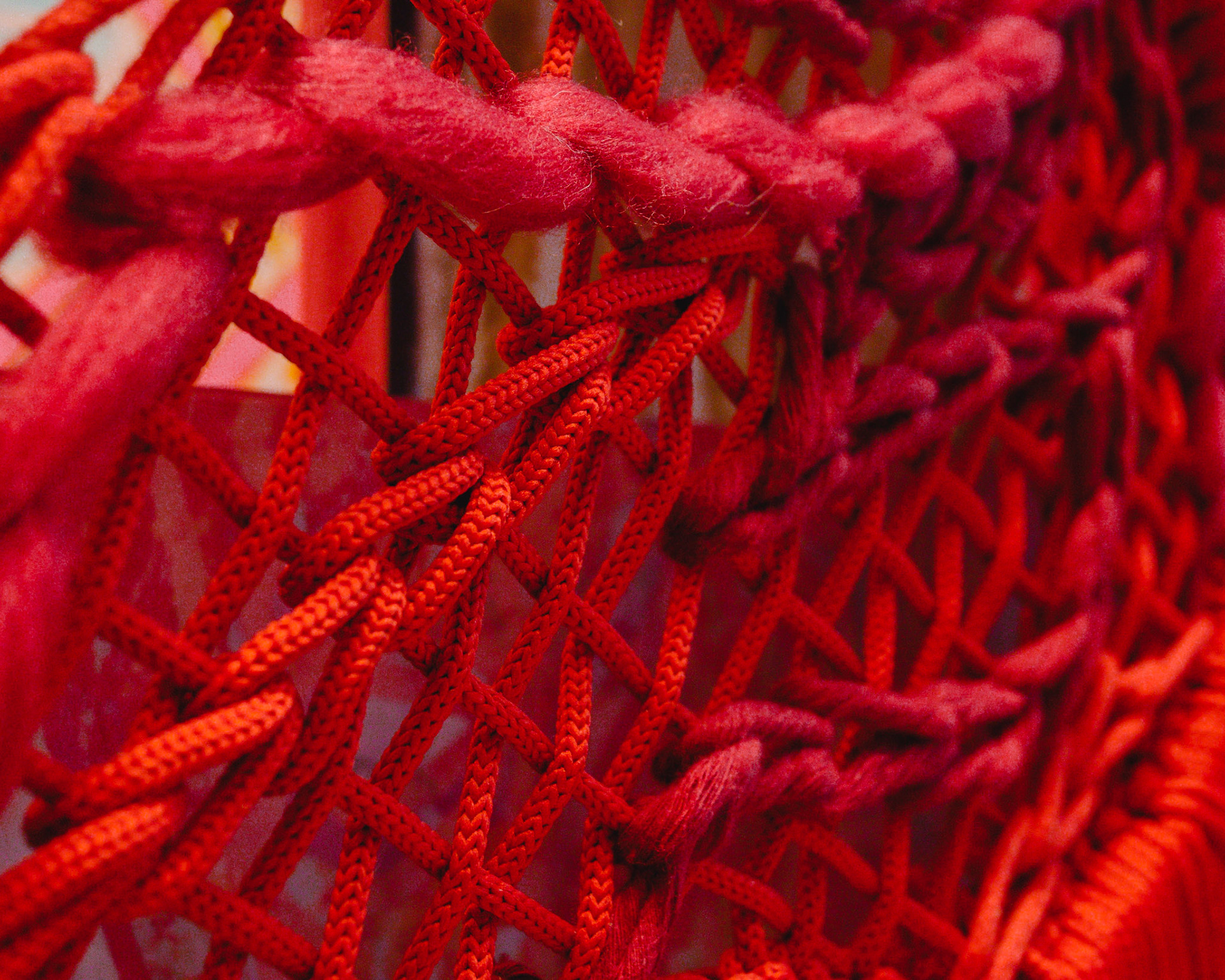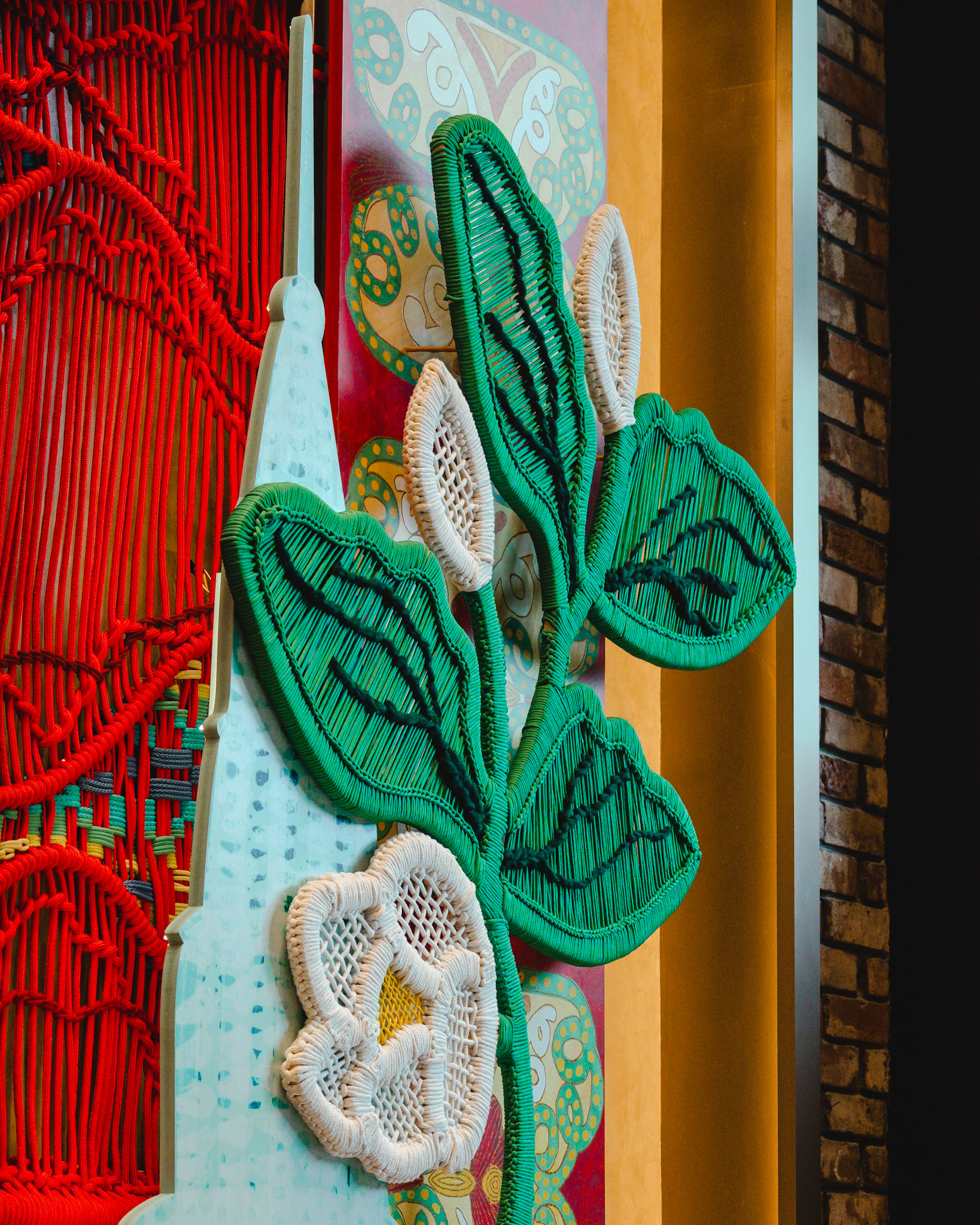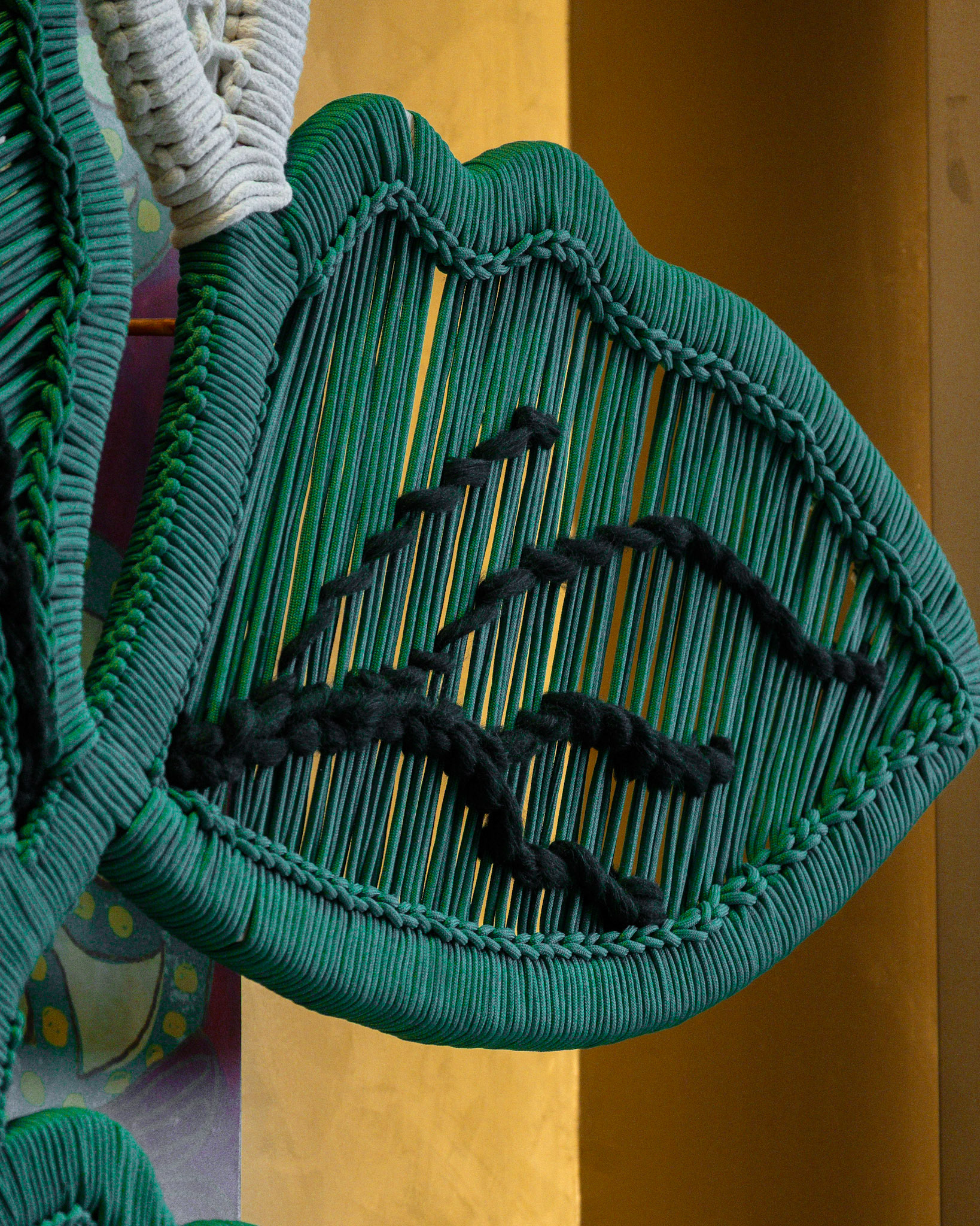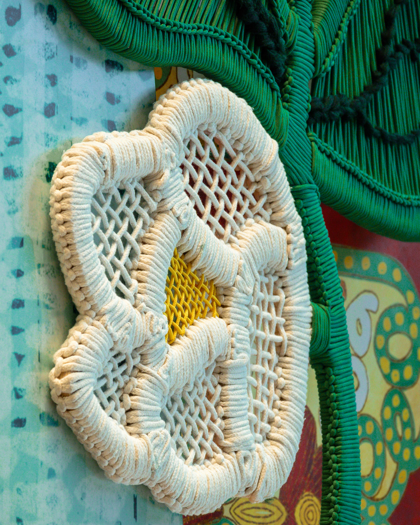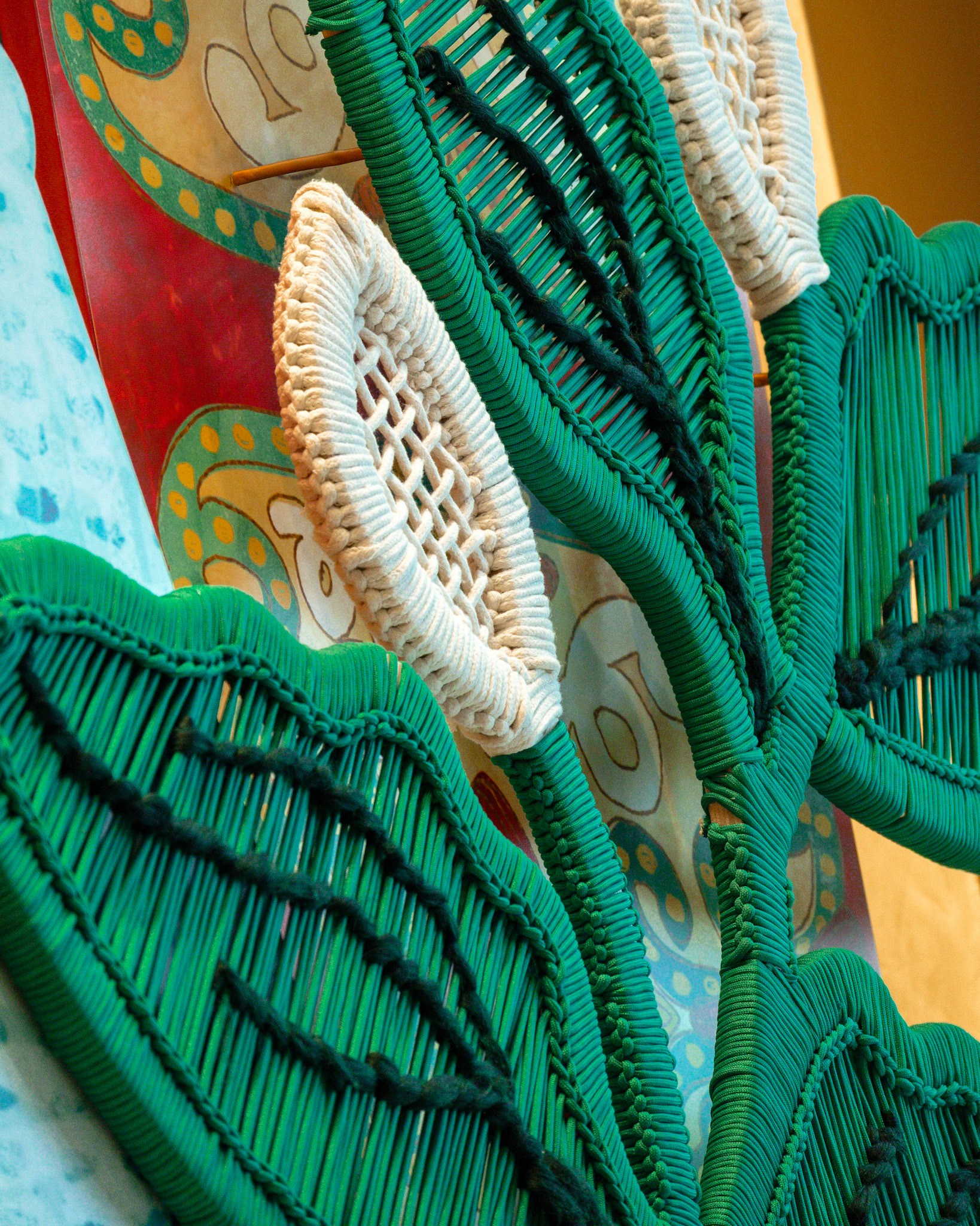 Each knot and strand captures the rhythm of the journey, the meeting of worlds; mapping mountains, valleys, and moments along the way, while the layered collaboration with Afi Sulaiman’s 2D illustrations creates a meeting point between texture and image, tradition and modernity.