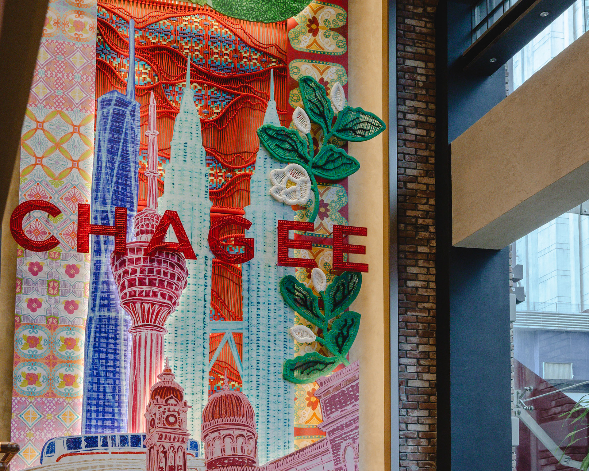 From the misty mountains of Yunnan to the vibrant heart of Kuala Lumpur, this artwork traces the ancient tea trading route as both a path and a memory. The woven panels, inspired by traditional Malaysian Songket and Kelarai, carry the Tampuk Manggis mudah / simplified mangosteen motif; a symbol of welcome and abundance, interlaced with the shifting silhouettes of mountain ranges landscape.