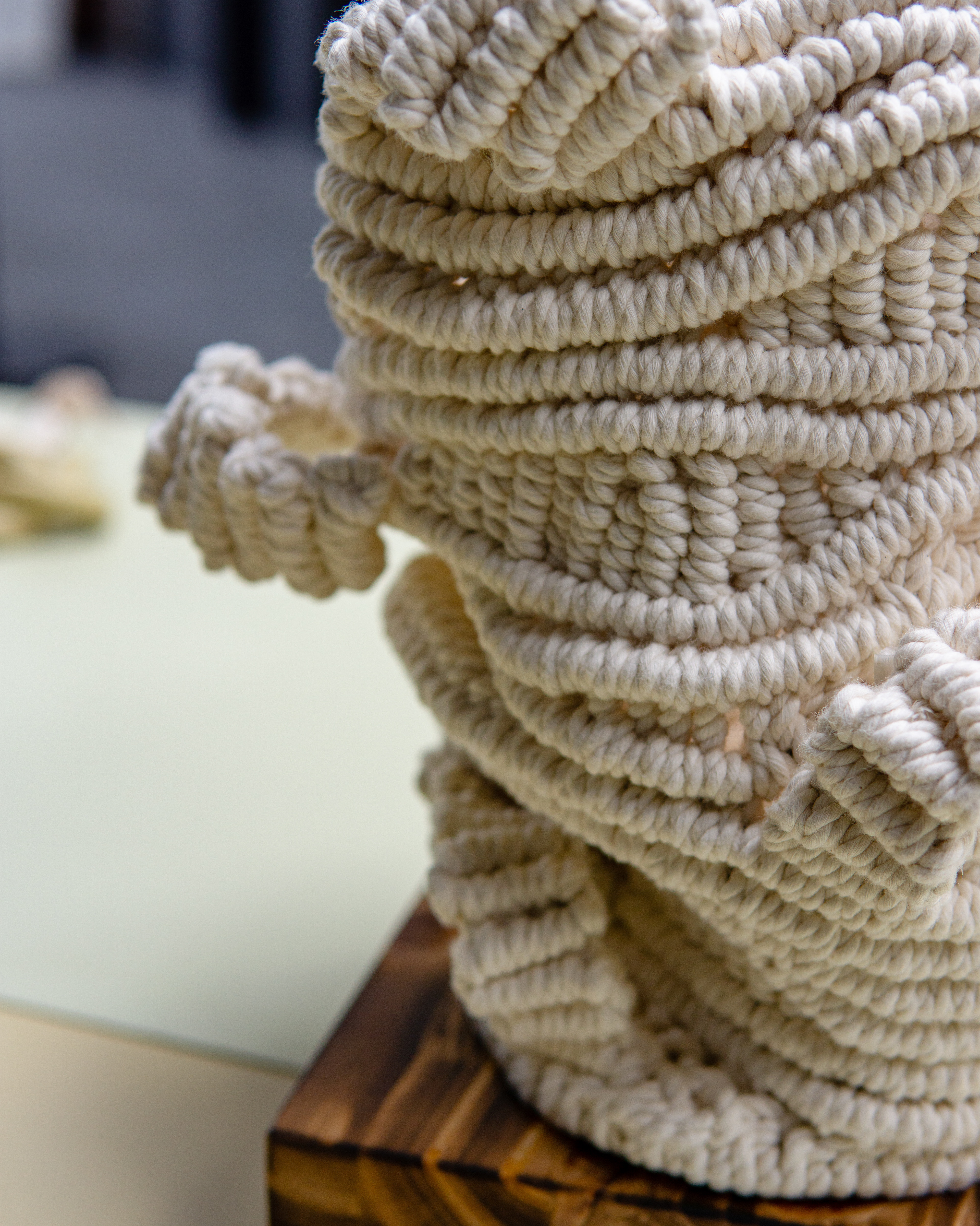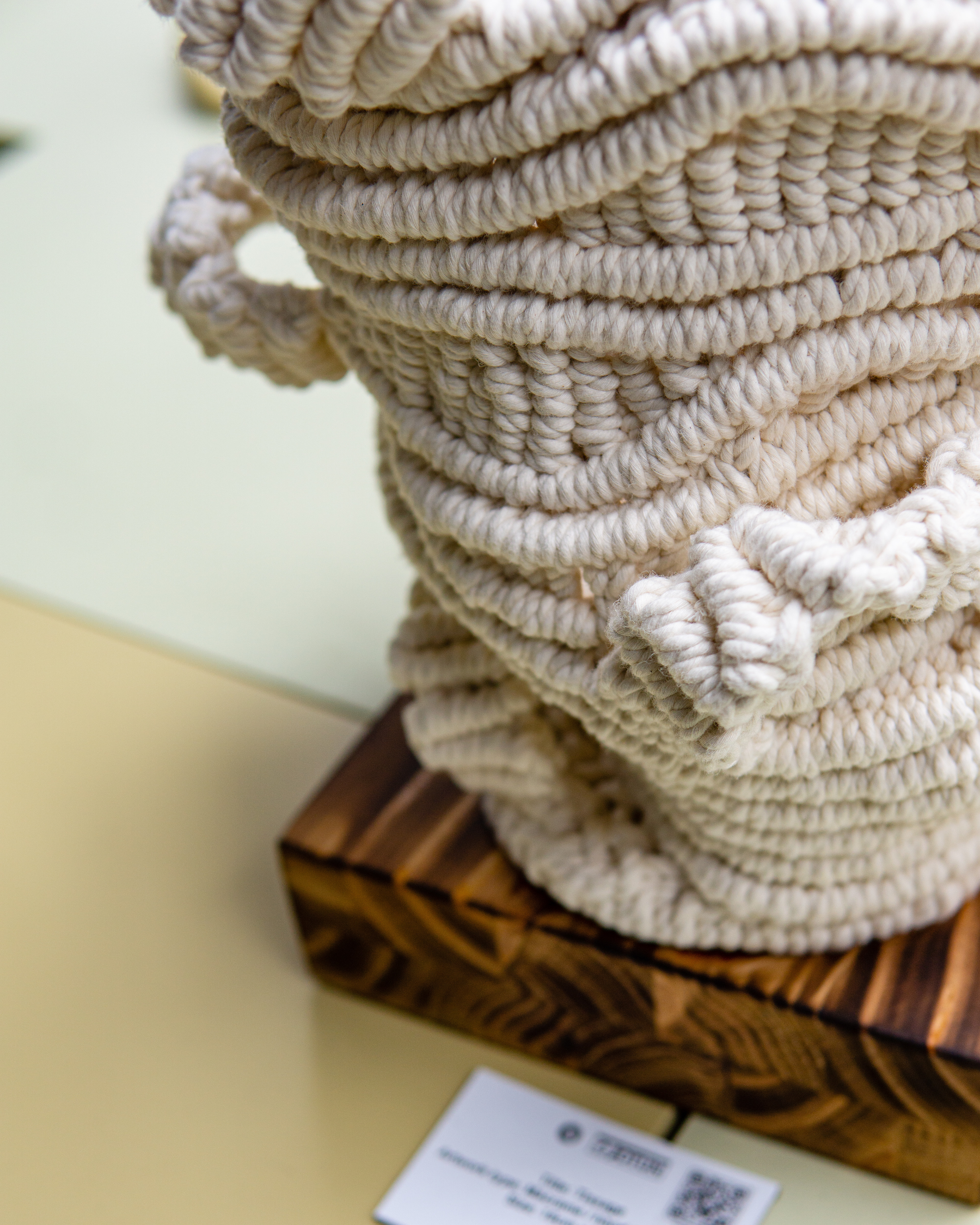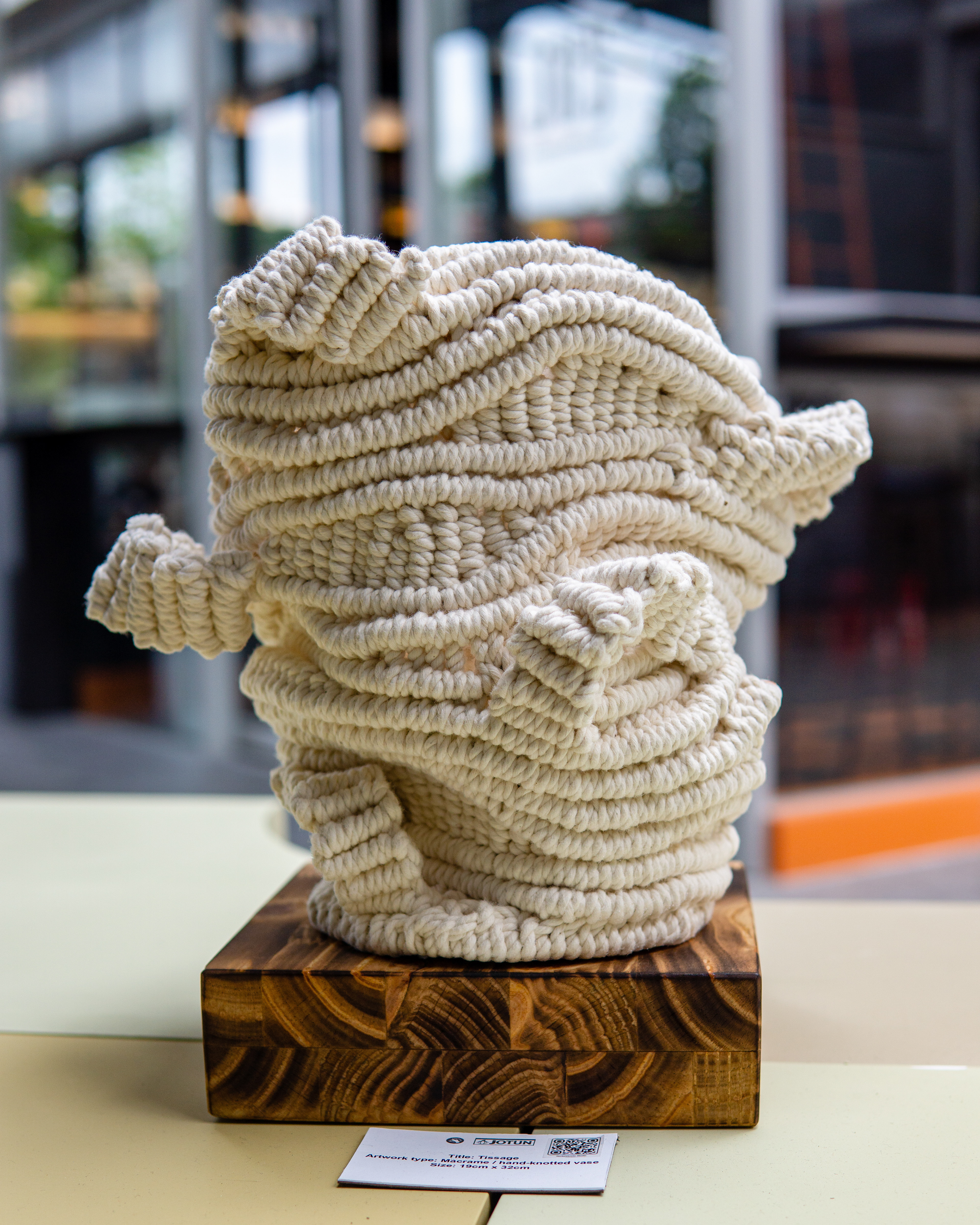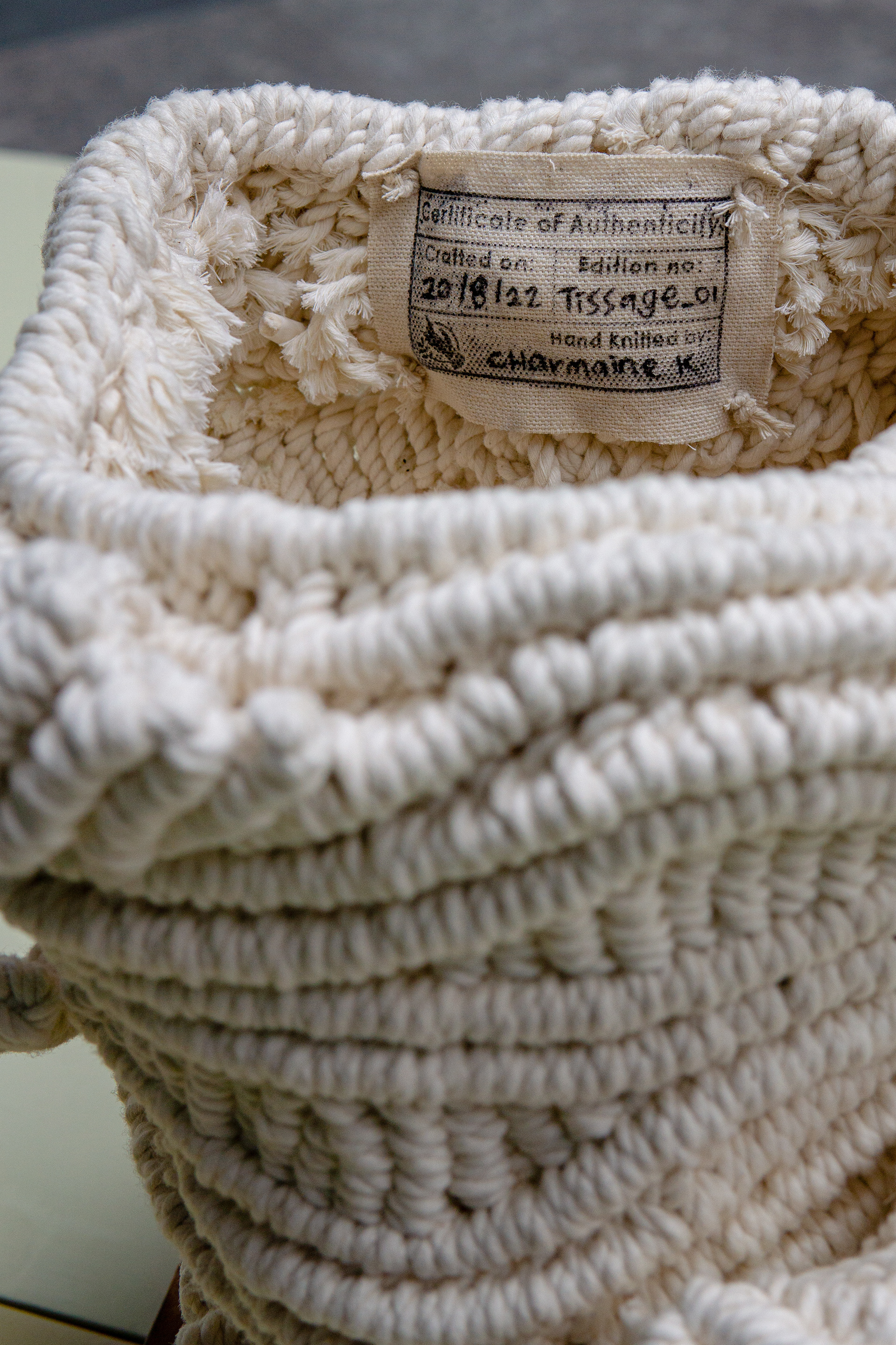 Tissage – An organically shaped vase sculpted entirely from 5mm three-ply rope. Guided by intuition, the form was shaped by hand, allowing its natural flow and curves to emerge freely. The piece embodies the meditative and expressive nature of handcraft, where form takes shape through rhythm and instinct.