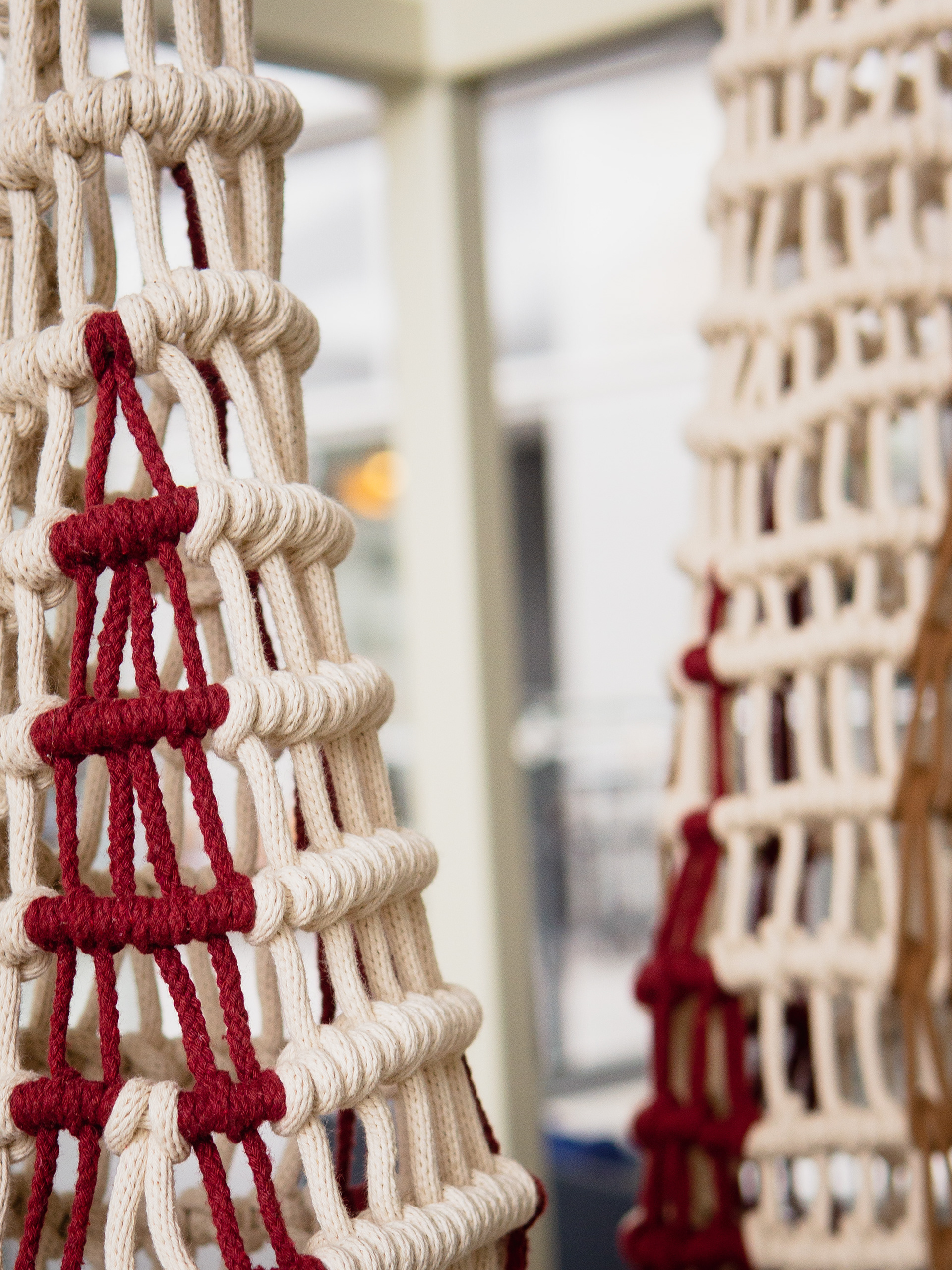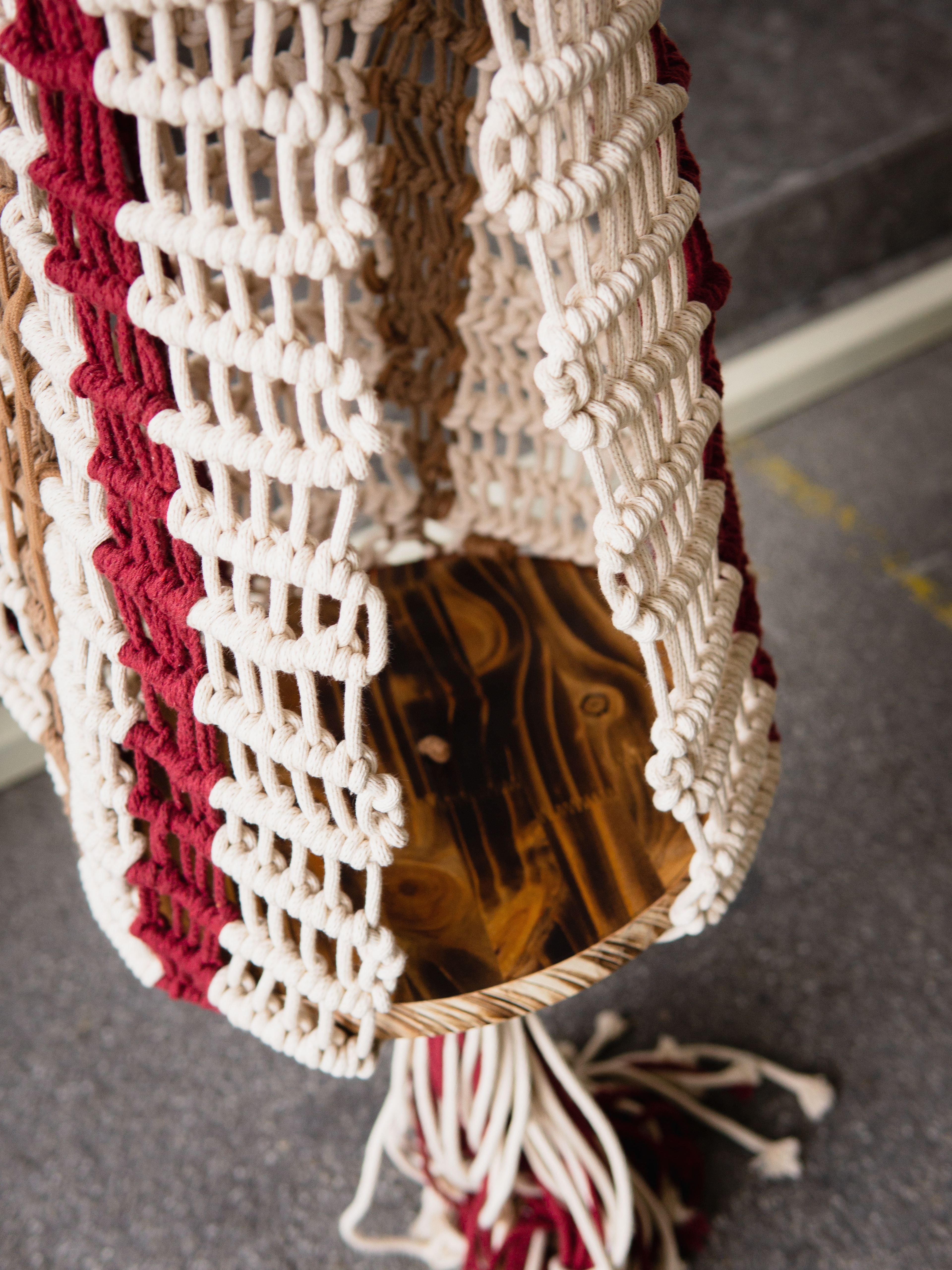 The Cocoon – Built upon a base structure of high-density braided cord, the form is layered with strings of varying textures to create soft, organic strokes of color across its surface. The piece embodies a state of transformation, a vessel for emergence and renewal. Conceived as a performance piece, it represents a performer enclosed within, striving to break free like a moth after metamorphosis - a poetic reflection on growth, confinement, and liberation.